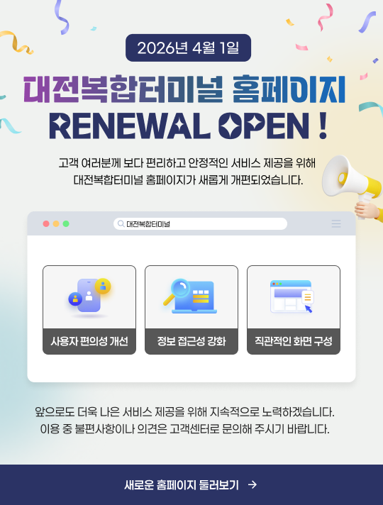 대전복합터미널 홈페이지 리뉴얼 안내 2026년 4월 1일부터 대전복합터미널 홈페이지가 신규 개편되었습니다.